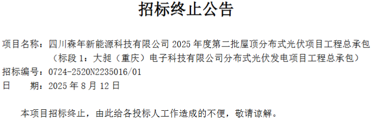 其中,8月12日四川森年新能源科技有限公司2025年度第二批屋顶分布式光伏项目工程总承包(标段1:大昶(重庆)电子科技有限公司分布式光伏发电项目工程总承包)招标宣布终止。