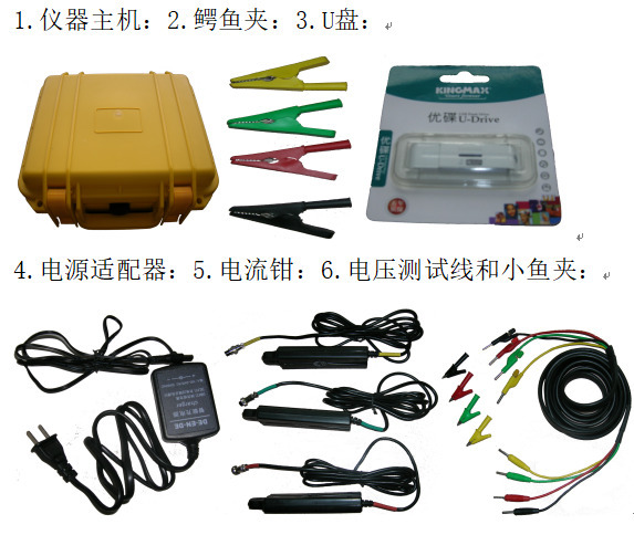 检查配件完整性,包括电压测试线(黄、绿、红、黑对应A/B/C/N相)、电流测试钳(通常3只)、电源适配器、数据线、存储卡(如需)等。